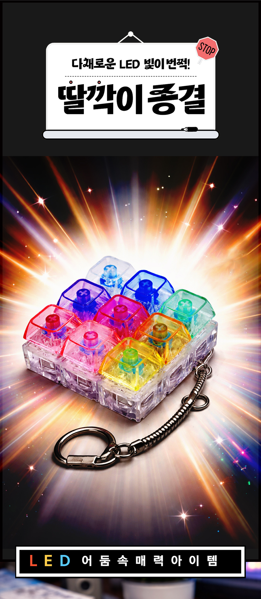 무지개 딸깍이 키링 LED 키보드 9구 열쇠고리 피젯